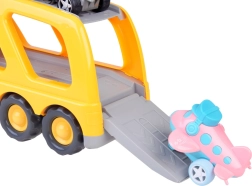 Šareni dječji transporter za avione i aute donosi sate kreativne igre. Tegljač s prikolicom ima gumb za svjetla i zvukove, frikcijski pogon za lako pokretanje i preklopnu rampu za udobno ukrcavanje. Izdržljiva plastična izrada i žive boje potiču razvoj mašte i motorike.