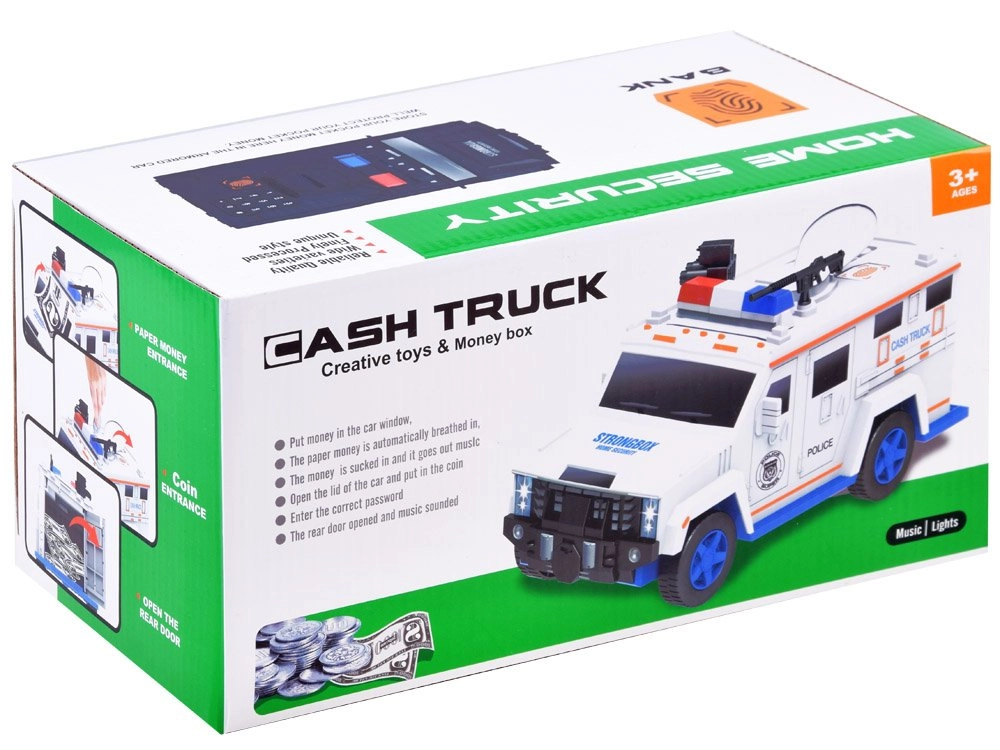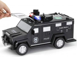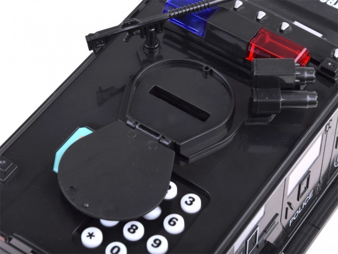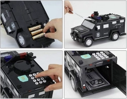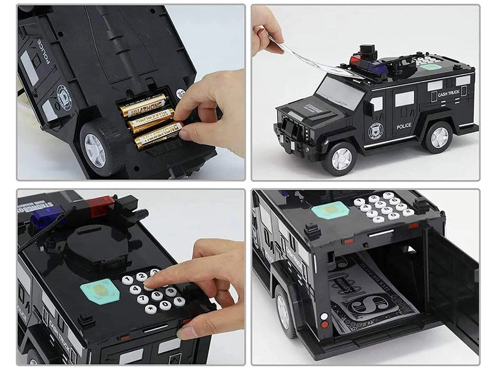 Ova interaktivna kasica u obliku policijskog automobila štiti dječju ušteđevinu i istovremeno zabavlja. Djeca mogu unijeti sigurnosni kod (zadano 0000), potvrditi ga dodirom na skener otiska prsta (simulacija) i otvoriti vrata sefa. Novčanice se automatski uvlače kroz prednji utor, a kovanice se ubacuju kroz gornji otvor ispod poklopca.
