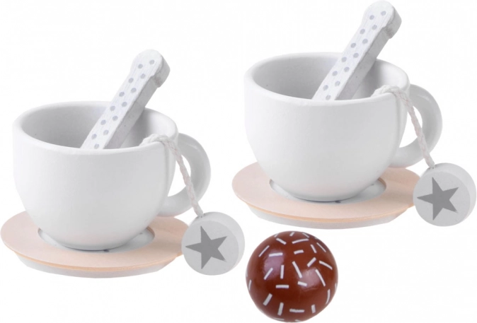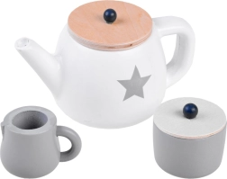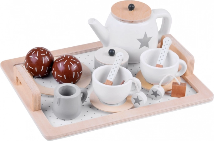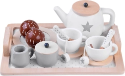 Svi dijelovi imaju nježne detalje – zvjezdice i točkice – koji setu daju šarm. Djeca mogu „posluživati” čaj, šećer i mlijeko te nuditi drvene kolačiće. Set razvija finu motoriku, komunikaciju i kreativnost.