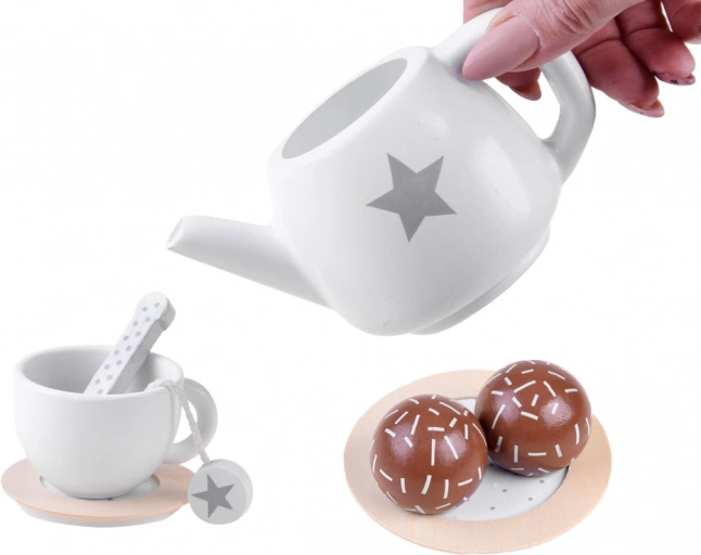 Čajnik, šalice, tanjurići, šećernica, vrč za mlijeko i deserti – sve usklađeno u bež-bijelom dizajnu sa zvjezdicama za savršenu igru čaja.