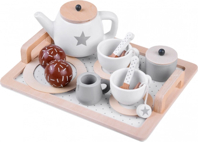 Stilizan drveni set za čaj u nježnim bež i bijelim tonovima donosi sigurnu igru posluživanjem čaja. Sadrži pladanj, čajnik, šalice, tanjuriće, šećernicu, vrč za mlijeko i drvene poslastice – sve s slatkim motivima zvjezdica i točkica. Izdržljiva drvena izrada, glatki rubovi i netoksične boje potiču maštu i društvene vještine djece.