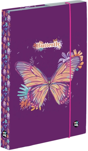 Praktična školska kutija za bilježnice formata A5 s motivom leptira. Štiti vaše bilježnice i papire zahvaljujući izdržljivom laminatu, ima zatvaranje elastičnom gumicom i hrbat širok 3 cm za više sadržaja.