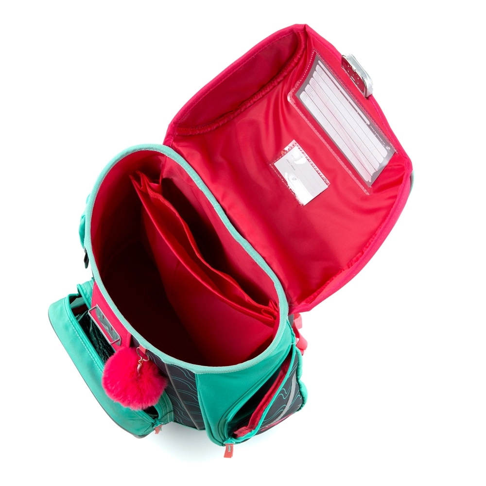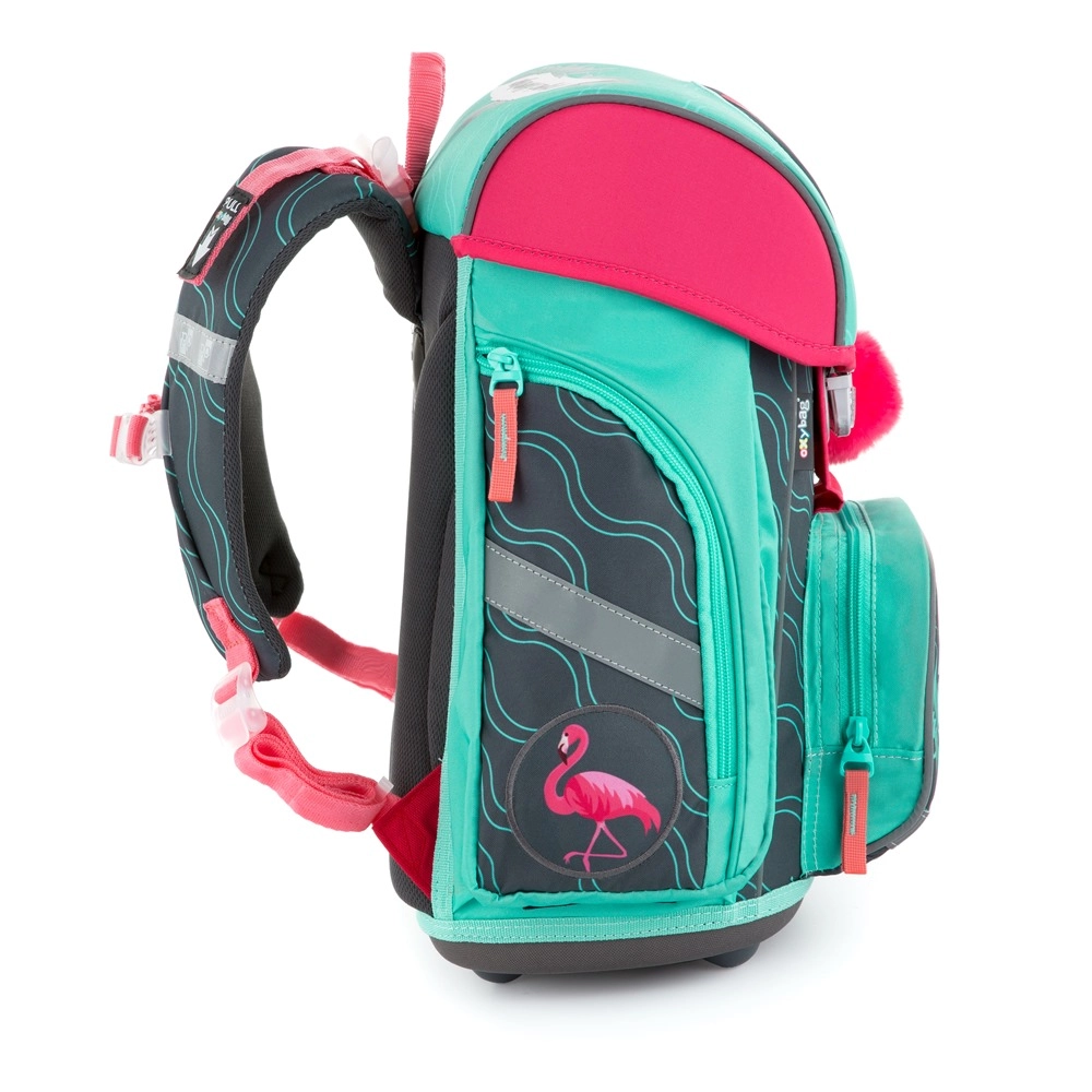 Ova školska torba iz linije Premium kombinira udobnost, sigurnost i moderan dizajn s motivom flaminga. Anatomski oblikovana i ojačana leđa zajedno s prozračnom podstavom podupiru pravilno držanje tijela i udobnost pri svakodnevnom nošenju. Zahvaljujući maloj težini i širokim podstavljenim naramenicama torba ravnomjerno raspoređuje teret na djetetova ramena.