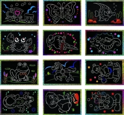 Ovaj set grebajućih sličica idealan je izbor za prve kreativne korake. Jednostavno načelo skidanja cijelog motiva bez složenih detalja djeca lako shvaćaju i odmah vide rezultat: prekrasne svjetlucave i šarene sličice koje se efektno sjaje.