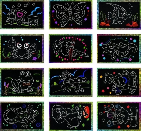 Ovaj set strugalica idealan je izbor za prve kreativne aktivnosti. Jednostavan princip skidanja cijelog motiva bez složenih detalja djeca lako shvaćaju i odmah vide rezultat: prekrasne sjajne i šarene sličice koje se efektno presijavaju.