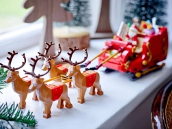 Složite detaljne crvene saonice s elegantnim zlatnim akcentima i upregnite četiri jelena s uklonjivim sedlima za autentičan božićni doživljaj.