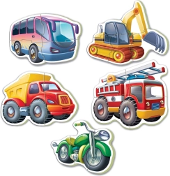 Ovaj set sadrži pet progresivnih slagalica s motivima omiljenih vozila – od autobusa do vatrogasnog vozila. Zahvaljujući postupno rastućoj težini (3, 4 i 5 dijelova) djeca prirodno uvježbavaju logičko razmišljanje i strpljenje. Vesele boje i prijateljske ilustracije zadržat će njihovu pažnju i podržati radost otkrivanja.