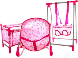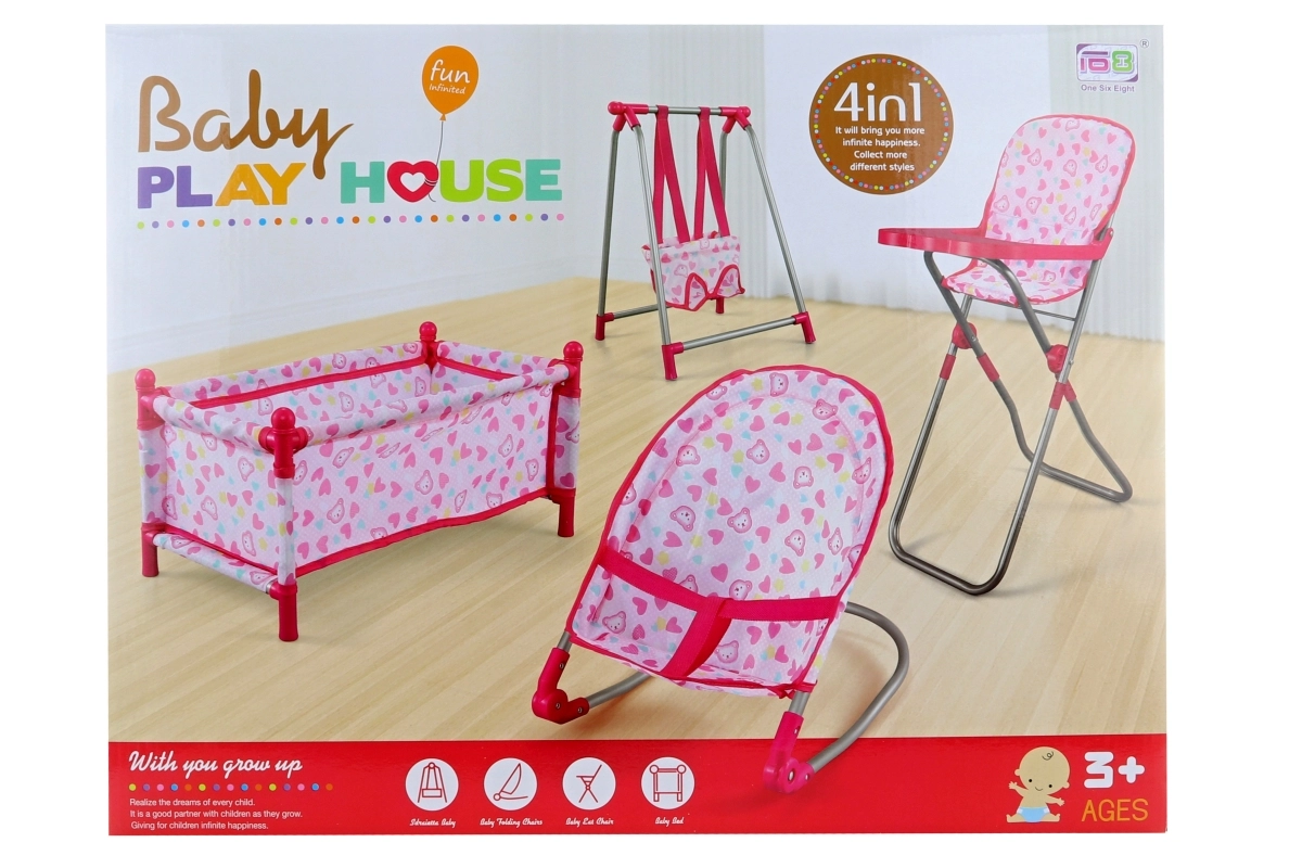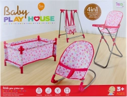 Set za lutku 4u1 sadrži ležaljku, ljuljačku, hranilicu i krevetić. Dimenzije pakiranja cca 37 x 47,5 x 10 cm. Dob: 3+