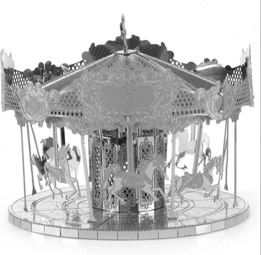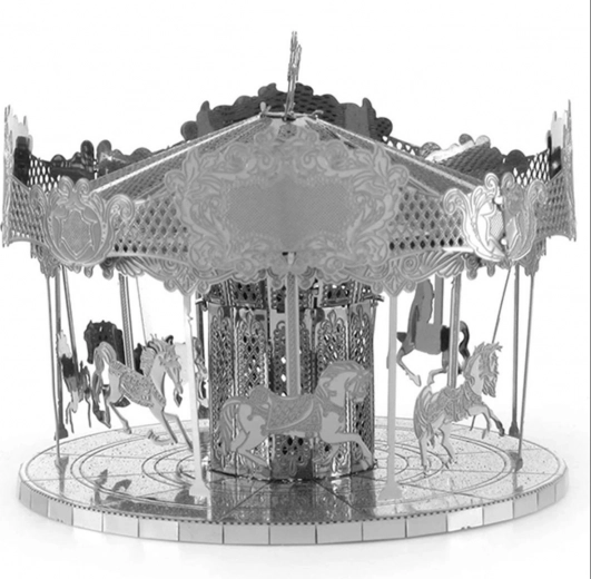 Otkrijte čar klasičnih vašara u minijaturnom obliku. Model vrtuljka iz serije METAL EARTH precizno je izrađen od čeličnih listova s finim laserskim graviranjem, koje dodaje realistične detalje konjića, krova i ukrasnih ploča. Sastavljanje zahtijeva strpljenje i spretnost, no nagrada je upečatljiva dizajnerska dekoracija koja će se istaknuti na polici ili radnom stolu.