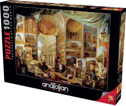 Ljubitelji puzzli i umjetnosti pronaći će zadovoljstvo u slaganju ovog prekrasnog puzzla Unutrašnjost imaginarne galerije slika. Složeni puzzle ima dimenzije otprilike 66 x 48 cm, što pruža dovoljno prostora za detalje i boje.