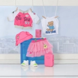 Set je namijenjen za lutke veličine 43 cm i potiče razvoj mašte, igre uloga i finu motoriku prilikom presvlačenja i aranžiranja dodataka. Kvalitetna izrada i promišljeni detalji osiguravaju da outfit izdrži brojne izlete i svakodnevnu igru.