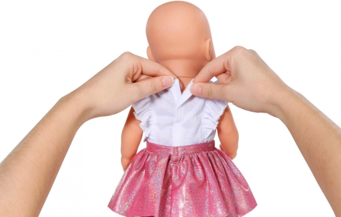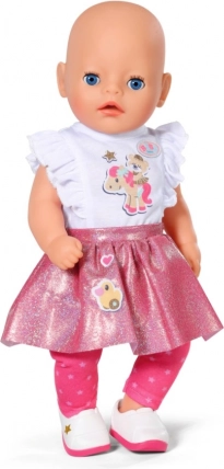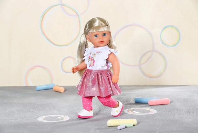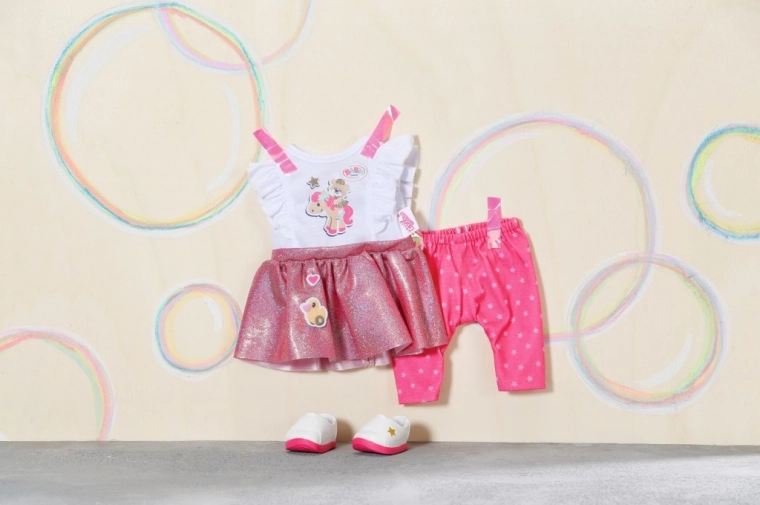 Priuštite svojoj lutki BABY born Little (36 cm) čaroban outfit koji spaja udobnost i stil. Bijeli top s volanastim rukavima i razigranim printom može se nositi samostalno kao haljinica ili uskladiti s ružičastim tajicama sa zvjezdastim uzorkom i sjajnom suknjom. Set upotpunjuju bijele cipelice s detaljnim zvjezdicama za savršeno usklađen izgled.