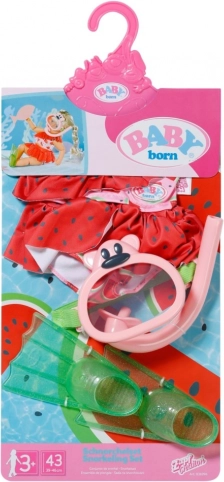 Ovaj zabavni set dodataka pretvara svako kupanje lutke u malu avanturu. Šareni kupaći s motivom lubenice, lagane peraje i udobna maska za šnorklanje savršeno pristaju lutkama BABY born veličine 43 cm te potiču maštu i kreativnu igru.