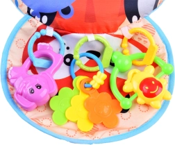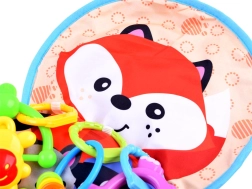 Šuškava mini podloga i šarene zvečke razvijaju vid, sluh i dodir te potiču koordinaciju ruku.