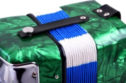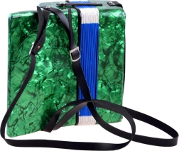 Otkrijte radost muziciranja s ovom velikom dječjom harmonikom u zelenoj boji. Izgleda kao pravi instrument, potiče finu motoriku, glazbeni sluh i učenje razlikovanja tonova. Zahvaljujući klavijaturi i bas tipkama, udobnom remenu i sigurnosnoj kopči mijeha sviranje je jednostavno i sigurno – idealno za male početnike glazbenike.