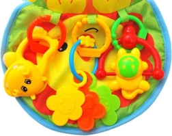 Šarena šuškava mini podloga i odvojive zvečke potiču razvoj vida, sluha i fine motorike.