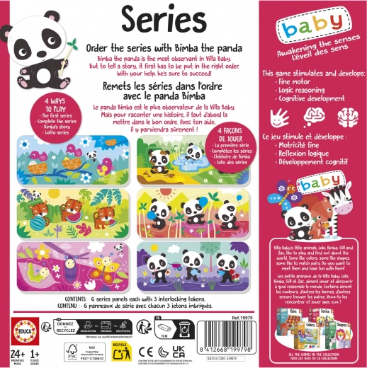 Zabavna i edukativna umetanka za najmlađe od 24 mjeseca marke EDUCA. Set sadrži 6 jednostavnih slagalica po 3 dijela s motivom simpatične pande Bimbe i njezinih prijatelja. Podržava finu motoriku, pažnju, znatiželju i maštu djece. Veliki i čvrsti dijelovi olakšavaju držanje i slaganje, učenje se odvija kroz igru.