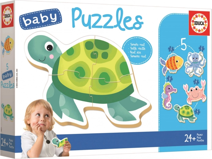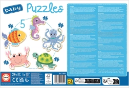 Baby puzzle EDUCA Vodene životinje 5u1 osmišljene su posebno za najmlađe. Potiču psihomotorički razvoj, koordinaciju ruka–oko te strpljenje i logičko razmišljanje. Složena slika mjeri približno 15 × 15 cm, idealna veličina za male ruke i prve uspjehe.