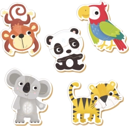 Otkrijte zabavne obrisne baby puzzle za najmlađe od 24 mjeseca. Pakiranje sadrži 5 progresivnih pzzli s motivima divljih životinja (3–5 dijelova). Veliki i čvrsti dijelovi lako se drže, potiču finu motoriku, pažnju i maštu.