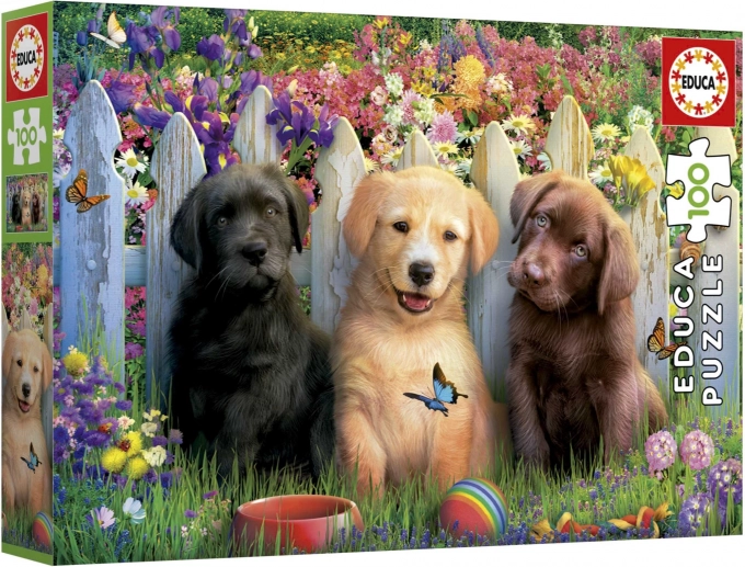 Tri razigrana šteneta u šarenom vrtu s cvijećem i leptirima privlače pozornost i motiviraju na slaganje.