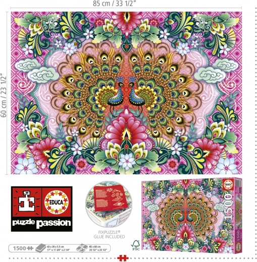 Puzzle od 1500 dijelova s motivom paunova. Dimenzije nakon slaganja cca 85 × 60 cm. U pakiranju besplatno ljepilo. Kvalitetan tisak i precizni dijelovi za odlično iskustvo.