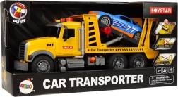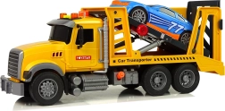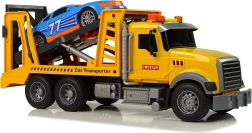 Žuti plastični vučni kamion s detaljnom izradom omogućuje djeci realistično prevoženje auta. Pritiskom narančastog gumba rampa se podiže, a na donjoj strani je možete ponovno spustiti. Integrirano pritisno kotačić blokira kotače i osigurava autić protiv skliznuća.