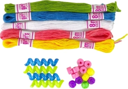 U pakiranju se nalazi bogat izbor perlica u nijansama ružičaste, žute, ljubičaste, zelene, plave i narančaste te pet pamučnih niti (zelena, plava, bijela, ružičasta, žuta), svaka duljine 8 m. U sklopu seta je i praktičan plavi češljić te detaljne upute za styling korak‑po‑korak.