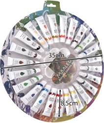 Kompletan set akrilnih boja s paletom za početnike i napredne. Sadrži 24 nijanse po 12 ml s živim pigmentima, visokom pokrivnošću i brzim sušenjem. Boje se lako miješaju, razrjeđuju vodom i nakon sušenja stvaraju trajni, vodootporni film. Pogodno za platno, papir, drvo, keramiku i tekstil.