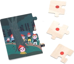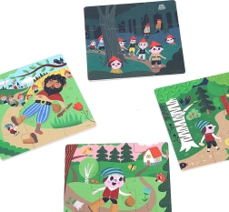 Ovaj set sadrži 4 puzzle s po 9 dijelova koje dočaravaju bajku o Palčiću. Svaka slika je prekrasna interpretacija priče koja potiče dječju maštu te poboljšava koncentraciju i logičko razmišljanje.