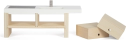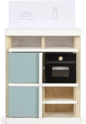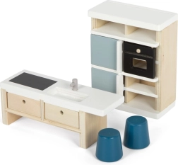 Ovaj lijepo dizajniran kuhinjski set za kućicu za lutke donosi realističan doživljaj igre. Sastoji se od visoke kuhinjske vitrine, otoka sa sudoperom i pločom za kuhanje te blagovaonskog stola s dvjema klupama i tabureima. Kuhinjska vitrinu sadrži kombinirani hladnjak sa zamrzivačem i pećnicu s vratima koja se otvaraju.