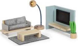 Ovaj lijepo izrađen set namještaja unosi u dječju igru realistične elemente koji pomažu razvijati svijet mašte malih arhitekata i dizajnera. Djeca se dodatno uključuju u igru zahvaljujući mogućnosti mijenjanja “TV programa” pomoću umetnih kartica, dok podni lampni stup stvara pravu atmosferu dnevnog boravka.