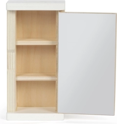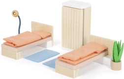 Minijaturna spavaća soba za kućicu za lutke od marke Small Foot donosi čar stvarnog namještaja u dječji svijet. Ovaj elegantni set namještaja uključuje bračni krevet koji se lako može podijeliti na dva odvojena kreveta, što nudi fleksibilnost za različite vrste igre. Uključeni su i dva jastuka, dva pokrivača, ormar s ogledalom, lampa i dva tepiha, koji upotpunjuju autentičnost ove minijaturne spavaće sobe.