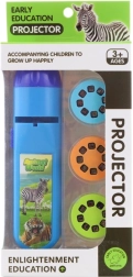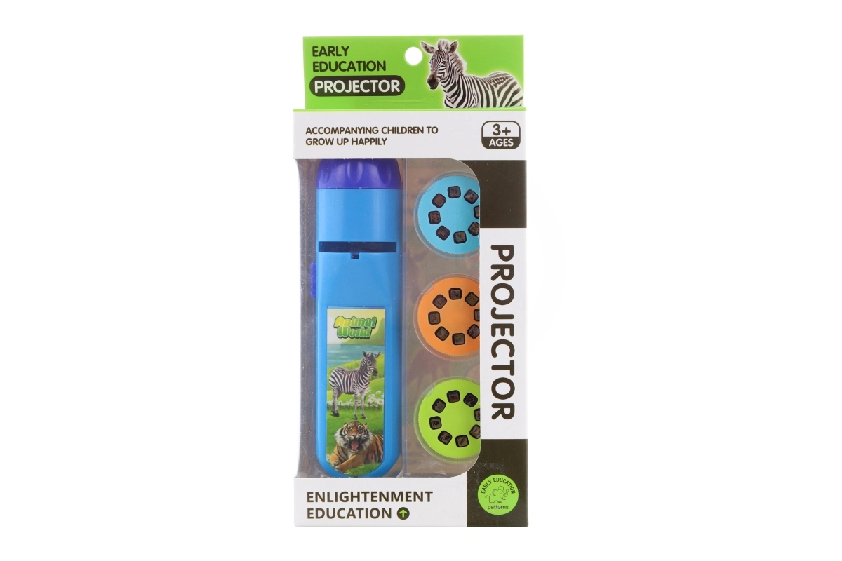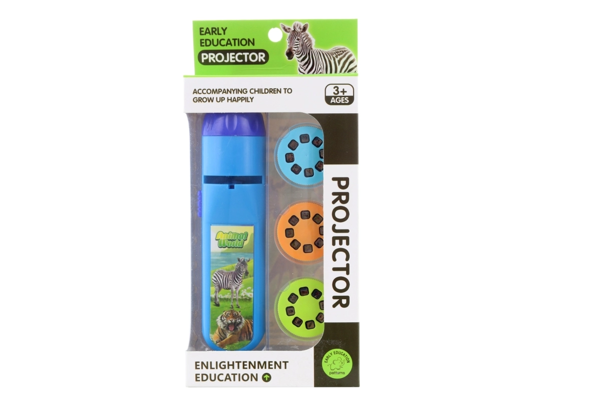 Plastični projektor na baterije. U kompletu su 3 kotačića sa slikama (ukupno 24 slike). Pritiskom na gumb projektor projicira slike na zid (ili drugu bijelu površinu). Napajanje s 3 AG13 baterije (uključene). Dimenzije projektora cca 13 x 3,5 cm. Dimenzije pakiranja cca 9,5 x 20,5 x 4 cm. Dob 3+