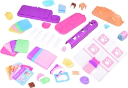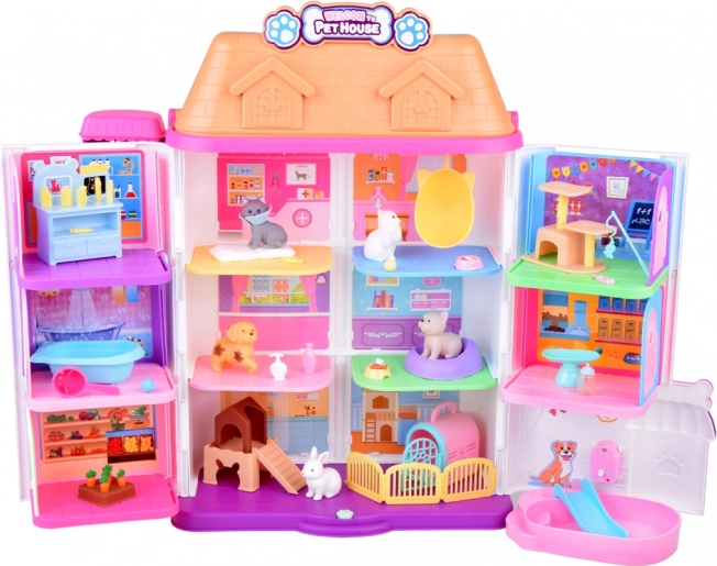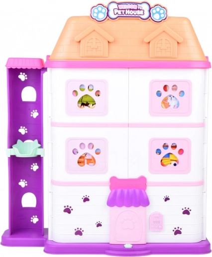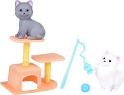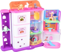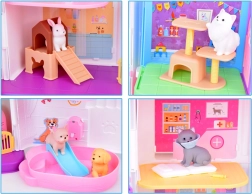 Kućica nudi 11 promišljeno osmišljenih prostorija, dizalo s košarom, terasu s bazenom i toboganom te zvono za još realističniju igru. U kompletu su gumene figurice (2 psića, 2 mačkice i zeko) te mnogo dodataka – od kade i zdjelica, preko ležajeva i grebalica, do preglednog stola i bolničkog kreveta.