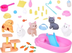 U pakiranju se nalaze 2 psića, 2 mačkice i zeko od mekane gume, zajedno s namještajem i priborom za njegu, igru i odmor.