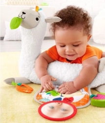 - Lama, meki potporni valjak, obostrana mini prostirka s džepom, 3 igračke (ogledalce, zvečkica lubenica, grickalica mrkvica)