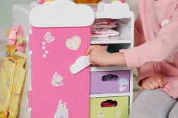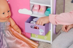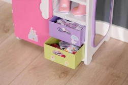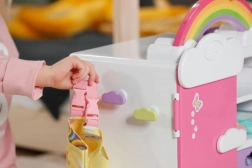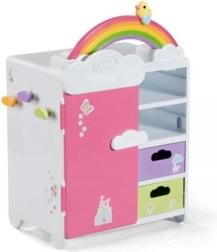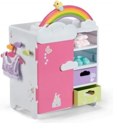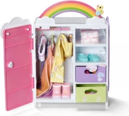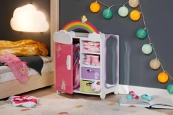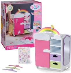 Otkrijte dugin ormar BABY born koji spaja pametnu organizaciju i razigran dizajn. Djeca će obožavati svjetleću dugu s patkicom Bertom i radosnu melodiju pri odabiru odjeće. Ormar nudi dovoljno mjesta za sve dodatke i odjeću za lutke – od haljinica do cipelica.