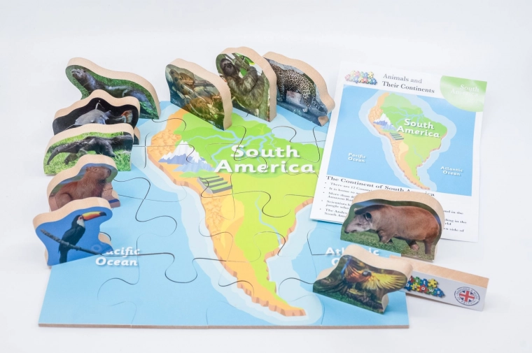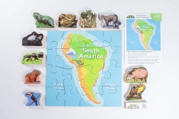 Drvene puzzle Južna Amerika i njezine životinje predstavljaju edukativnu zabavu za djecu, koja spaja upoznavanje kontinenata i njihove faune s razigranim oblikom učenja.