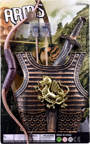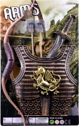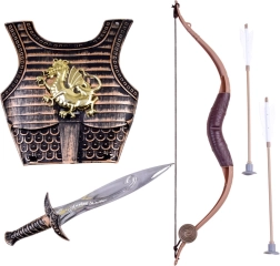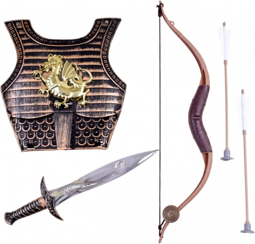 Set sadrži oklop, luk, dvije strijele i mač – idealna kombinacija za maštovite bitke i karnevalske kostime.