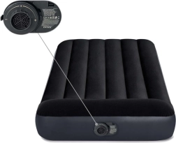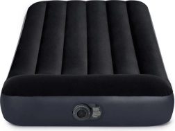 Uživajte u udobnom snu bilo gdje. Ovaj jednokrevetni nafukovni krevet INTEX kombinira izdržljiv PVC s ugodnim, vodootpornim velurom, koji sprječava klizanje plahte i povećava udobnost. Integrirana pumpa štedi vrijeme – madrac se napuhne u trenu i jednako se lako ispuhuje.