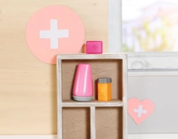 Set uključuje ružičasta medicinska pomagala kao što su škare i maska, idealno za igranje doktora.