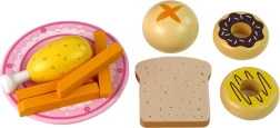 Uključeni su tanjur i izbor namirnica: krafne, pecivo, pomfrit i pileća batkica – idealno za posluživanje i igru kuhara.