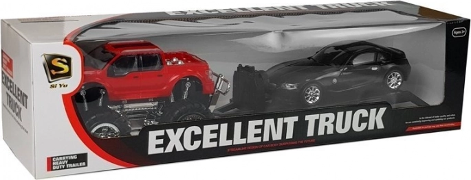 - Crveni monster truck, prikolica (autonosač), crni BMW