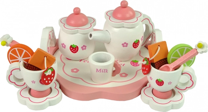 Preslatki drveni čajni set u bijelo‑ružičastom dizajnu s motivima jagoda idealan je za dječje čajanke. Potiče kreativnost, igranje uloga i finu motoriku. Sadrži pladanj s ručkama, čajnik, 2 šalice, vrč za mlijeko, žličice i dodatke. Sigurna izrada od drveta, izdržljiv i prikladan kao poklon.
