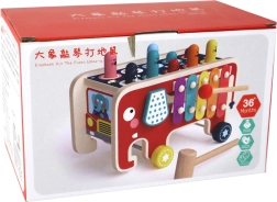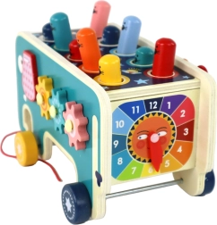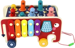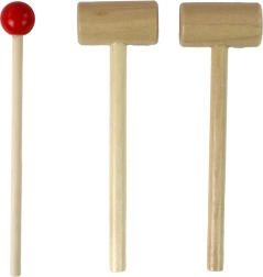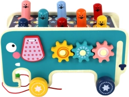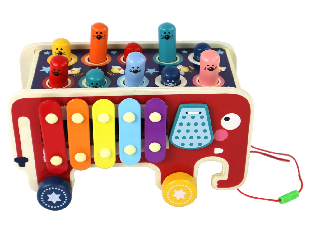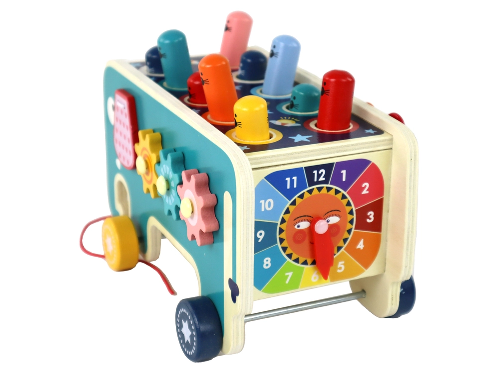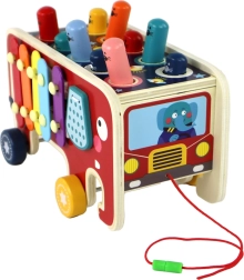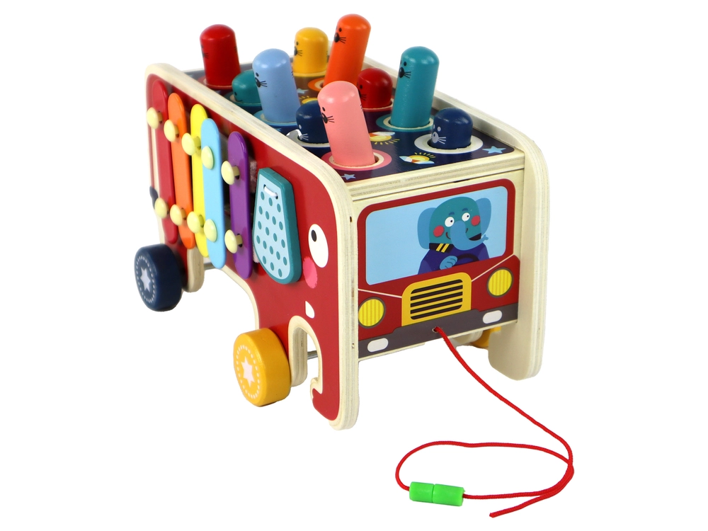 Set je kompletan i sadrži autić s povlačnim konopcem, 2 palice za igru "Whac-a-Mole" i palicu za činele. Igračka je izrađena od zdravstveno ispravnog drveta, što jamči izdržljivost i sigurnost za djecu.