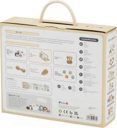- U pakiranju ćete naći: kontrastne kartice, drveno ogledalce, valjkastu zvečku, disk za prebacivanje, dvostruki maracas i set taktilnih loptica