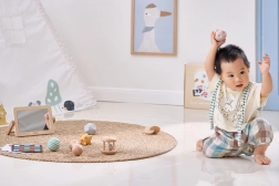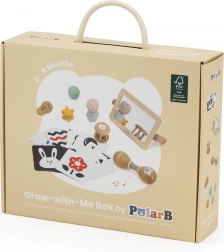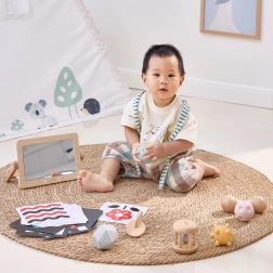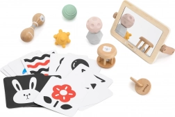 Ovaj pomno sastavljen set podržava prirodan razvoj bebe od prvih dana. Visokokontrastne kartice treniraju fiksaciju pogleda i prepoznavanje oblika, drveno ogledalce pomaže u samootkrivanju i tijekom “tummy timea”, a zvečke i maracasi razvijaju ritam, sluh i koordinaciju. Različite teksture i oblici taktilnih loptica potiču finu i grubu motoriku te jačaju hvat.