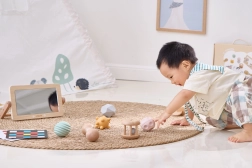 Izdržljivo ogledalce s drvenim okvirom pomaže tijekom “tummy timea”, potiče podizanje glavice, jača vrat i donosi prvi kontakt s vlastitim odrazom. Odlično za razvoj samosvijesti i socijalnih vještina.