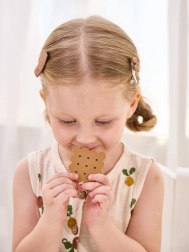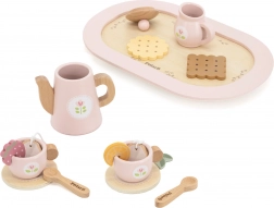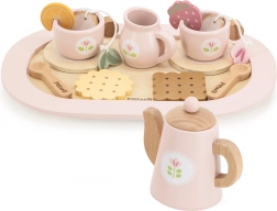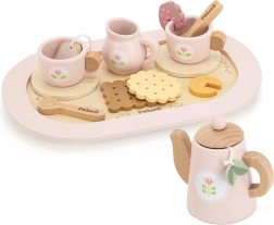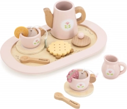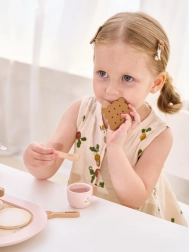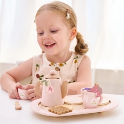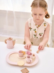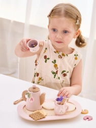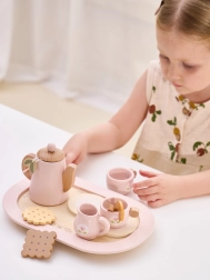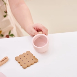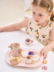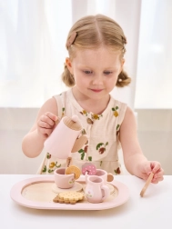 Set nudi sve potrebno za posluživanje: čajnik s poklopcem, šalice s tanjurićima, vrč za mlijeko, žličice, čajne vrećice, kriške voća i mirisne “kekse”, sve na praktičnom pladnju. Zahvaljujući sastavu elemenata, odličan je dodatak dječjoj sobi u Montessori duhu, a ujedno i prekrasan poklon koji će razveseliti svakog malog domaćina.
