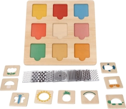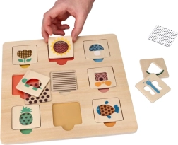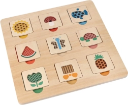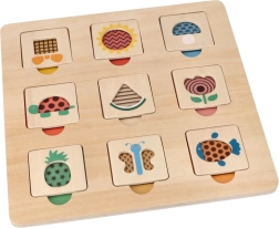 Pametna i zabavna drvena slagalica za najmlađe potiče razvoj fine motorike, prepoznavanje boja, oblika i uzoraka te vježba logičko razmišljanje. Ploča dimenzija 28 × 28 cm s devet šarenih dijelova idealna je za djecu od 12 mjeseci, a zahvaljujući sigurnoj drvenoj izradi i glatkim rubovima odličan je izbor za prve igre i učenje.